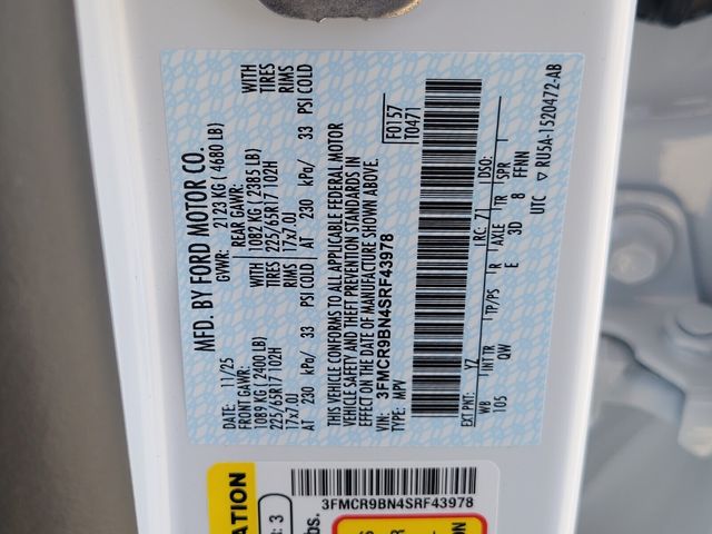 4-Wheel Disc Brakes, 6 Speakers, ABS brakes, Air Conditioning, Alloy wheels, AM/FM radio: SiriusXM, AM/FM Stereo, Auto High-beam Headlights, Automatic temperature control, Brake assist, Cloth w/Easy-to-Clean Front Bucket Seats, Compass, Delay-off headlights, Driver door bin, Driver vanity mirror, Dual front impact airbags, Dual front side impact airbags, Electronic Stability Control, Emergency communication system: SYNC 4 911 Assist, Four wheel independent suspension, Front anti-roll bar, Front Bucket Seats, Front Center Armrest, Front reading lights, Fully automatic headlights, Heated door mirrors, Illuminated entry, Knee airbag, Low tire pressure warning, Occupant sensing airbag, Outside temperature display, Overhead airbag, Overhead console, Panic alarm, Passenger door bin, Passenger vanity mirror, Power door mirrors, Power steering, Power windows, Radio data system, Rear anti-roll bar, Rear Parking Sensors, Rear reading lights, Rear seat center armrest, Rear window defroster, Rear window wiper, Remote keyless entry, Security system, SiriusXM, Speed control, Speed-sensing steering, Speed-Sensitive Wipers, Split folding rear seat, Steering wheel mounted audio controls, SYNC 4 w/Enhanced Voice Recognition, Tachometer, Telescoping steering wheel, Tilt steering wheel, Traction control, Trip computer, Variably intermittent wipers, and Wheels: 17" Carbonized Gray-Painted Aluminum.