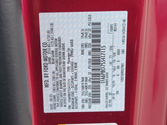 Equipment Group 301A High Package (9-Speaker Stereo System and Cloth/Vinyl Heated Bucket Seats), Mustang Nite Pony Package (Headlamps w/Black Bezels), Mustang Nite Pony Package w/Shadow Black Paint, 3.55 Limited Slip Rear Axle, 4-Wheel Disc Brakes, ABS brakes, Active Valve Performance Exhaust, Air Conditioning, Alloy wheels, AM/FM Stereo, Auto High-beam Headlights, Automatic temperature control, Brake assist, Bumpers: body-color, Compass, Delay-off headlights, Driver door bin, Driver vanity mirror, Dual front impact airbags, Dual front side impact airbags, Electronic Stability Control, Emergency communication system: 911 Assist, Exterior Parking Camera Rear, Four wheel independent suspension, Front anti-roll bar, Front Bucket Seats, Front Center Armrest, Front dual zone A/C, Front reading lights, Fully automatic headlights, Illuminated entry, Internet access capable: FordPass Connect, Knee airbag, Leather Shift Knob, Leather steering wheel, Low tire pressure warning, Occupant sensing airbag, Outside temperature display, Overhead airbag, Overhead console, Panic alarm, Passenger door bin, Passenger vanity mirror, Power door mirrors, Power steering, Power windows, Radio data system, Rain sensing wipers, Rear anti-roll bar, Rear Parking Sensors, Rear window defroster, Remote keyless entry, Speed control, Speed-sensing steering, Speed-Sensitive Wipers, Split folding rear seat, Spoiler, Sport steering wheel, Steering wheel mounted audio controls, SYNC 4, Tachometer, Telescoping steering wheel, Tilt steering wheel, Traction control, Trip computer, Variably intermittent wipers, and Voltmeter. *Some rebates have qualifications. ##Ford Credit Retail Bonus Cash Rebate requires Ford Credit financing, not all buyers will qualify. ##Select Inventory Retail Customer Cash Rebate, vehicle must have arrived 61 days or more prior to sale, limited supply. ##Open or Special Trade Assistance Cash Rebate requires Trade in vehicle that is 1995 or newer. ##Price includes: $1000 - Final Days Mega Bonus Cash. Exp. 01/02/2026 $3500 - Retail Customer Cash. Exp. 01/05/2026