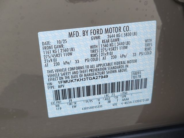 10 Speakers, 3rd row seats: bench, 4-Wheel Disc Brakes, ABS brakes, Air Conditioning, Alloy wheels, AM/FM radio: SiriusXM with 360L, Apple CarPlay/Android Auto, Auto High-beam Headlights, Automatic temperature control, Brake assist, Bumpers: body-color, Compass, Delay-off headlights, Driver door bin, Driver vanity mirror, Dual front impact airbags, Dual front side impact airbags, Electronic Stability Control, Emergency communication system: 911 Assist, Exterior Parking Camera Rear, Four wheel independent suspension, Front anti-roll bar, Front Bucket Seats, Front Center Armrest, Front dual zone A/C, Front fog lights, Front reading lights, Fully automatic headlights, Garage door transmitter, Heated door mirrors, Heated front seats, Heated steering wheel, Heated Unique Cloth Captain's Chairs, Illuminated entry, Internet access capable: FordPass Connect 5G, Knee airbag, Leather steering wheel, Low tire pressure warning, Navigation System, Occupant sensing airbag, Outside temperature display, Overhead airbag, Overhead console, Panic alarm, Passenger door bin, Passenger vanity mirror, Power door mirrors, Power driver seat, Power Liftgate, Power passenger seat, Power steering, Power windows, Radio: B&O Sound System by Bang and Olufsen, Rear air conditioning, Rear anti-roll bar, Rear reading lights, Rear window defroster, Rear window wiper, Remote keyless entry, Security system, Speed control, Speed-sensing steering, Speed-Sensitive Wipers, Split folding rear seat, Spoiler, Steering wheel mounted audio controls, Tachometer, Telescoping steering wheel, Tilt steering wheel, Traction control, Trip computer, Variably intermittent wipers, and Wheels: 20" Ebony-Painted Machined Aluminum. *Some rebates have qualifications. ##Ford Credit Retail Bonus Cash Rebate requires Ford Credit financing, not all buyers will qualify. ##Select Inventory Retail Customer Cash Rebate, vehicle must have arrived 61 days or more prior to sale, limited supply. ##Open or Special Trade Assistance Cash Rebate requires Trade in vehicle that is 1995 or newer. ##Price includes: $500 - Bonus Customer Cash. Exp. 01/05/2026