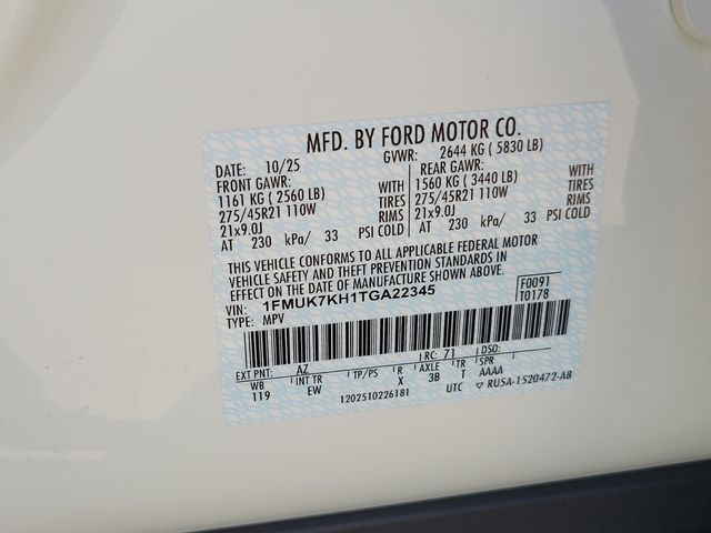 10 Speakers, 3rd row seats: bench, 4-Wheel Disc Brakes, ABS brakes, Air Conditioning, Alloy wheels, AM/FM radio: SiriusXM with 360L, Apple CarPlay/Android Auto, Auto High-beam Headlights, Automatic temperature control, Brake assist, Bumpers: body-color, Compass, Delay-off headlights, Driver door bin, Driver vanity mirror, Dual front impact airbags, Dual front side impact airbags, Electronic Stability Control, Emergency communication system: 911 Assist, Exterior Parking Camera Rear, Four wheel independent suspension, Front anti-roll bar, Front Bucket Seats, Front Center Armrest, Front dual zone A/C, Front fog lights, Front reading lights, Fully automatic headlights, Garage door transmitter, Heated door mirrors, Heated front seats, Heated steering wheel, Heated Unique Cloth Captain's Chairs, Illuminated entry, Internet access capable: FordPass Connect 5G, Knee airbag, Leather steering wheel, Low tire pressure warning, Navigation System, Occupant sensing airbag, Outside temperature display, Overhead airbag, Overhead console, Panic alarm, Passenger door bin, Passenger vanity mirror, Power door mirrors, Power driver seat, Power Liftgate, Power passenger seat, Power steering, Power windows, Radio: B&O Sound System by Bang and Olufsen, Rear air conditioning, Rear anti-roll bar, Rear reading lights, Rear window defroster, Rear window wiper, Remote keyless entry, Security system, Speed control, Speed-sensing steering, Speed-Sensitive Wipers, Split folding rear seat, Spoiler, Steering wheel mounted audio controls, Tachometer, Telescoping steering wheel, Tilt steering wheel, Traction control, Trip computer, Variably intermittent wipers, and Wheels: 20" Ebony-Painted Machined Aluminum. *Some rebates have qualifications. ##Ford Credit Retail Bonus Cash Rebate requires Ford Credit financing, not all buyers will qualify. ##Select Inventory Retail Customer Cash Rebate, vehicle must have arrived 61 days or more prior to sale, limited supply. ##Open or Special Trade Assistance Cash Rebate requires Trade in vehicle that is 1995 or newer. ##Price includes: $500 - Bonus Customer Cash. Exp. 01/05/2026