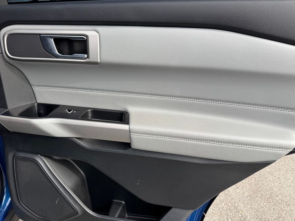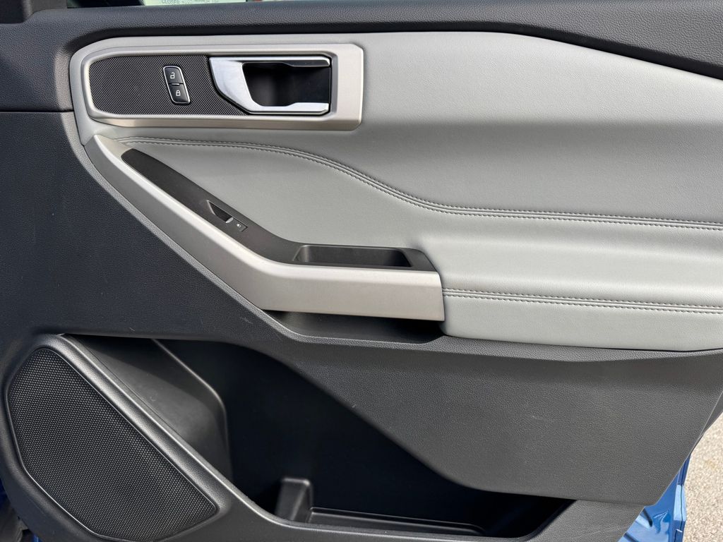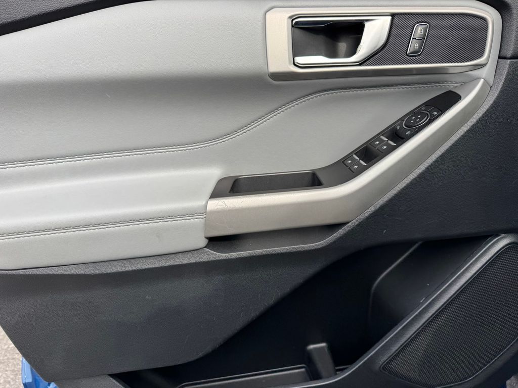 The Explorer's sleek exterior boasts a striking blue hue, complemented by the carbonized gray-painted grille and 20-inch 10-spoke wheels. Step inside and discover the premium cabin, featuring heated front seats, a heated steering wheel, and a voice-activated touchscreen navigation system.